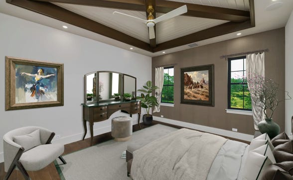 Enjoy indoor and outdoor culinary experiences with a Coyote grill on the covered patio and two propane tanks to fuel your outdoor kitchen and heating needs. Each room showcases tastefully chosen finishes by Twin Sisters Interior Design. Bedrooms feature soaring 12-foot ceilings, offering an airy, open ambiance. The home's thoughtful amenities include a gas fireplace, a tankless water heating system, and an aerobic septic system for efficient, modern living. Outside, you’ll find a circle drive with additional pad parking, a 3-car garage with an 8-foot entry door, and an electric car charging station.